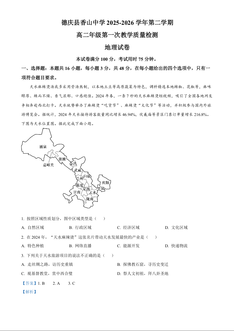 广东省肇庆市重点校2025-2026学年高二下学期4月期中考试 地理答案.docx