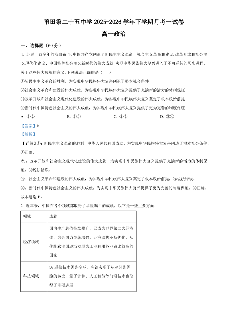 福建省莆田二十五中学2025-2026学年下学期4月月考 政治答案.docx