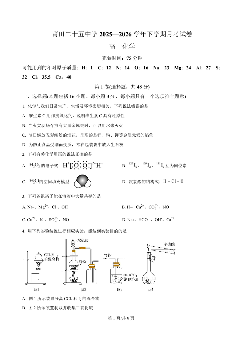 福建省莆田二十五中学2025-2026学年下学期4月月考 化学.docx