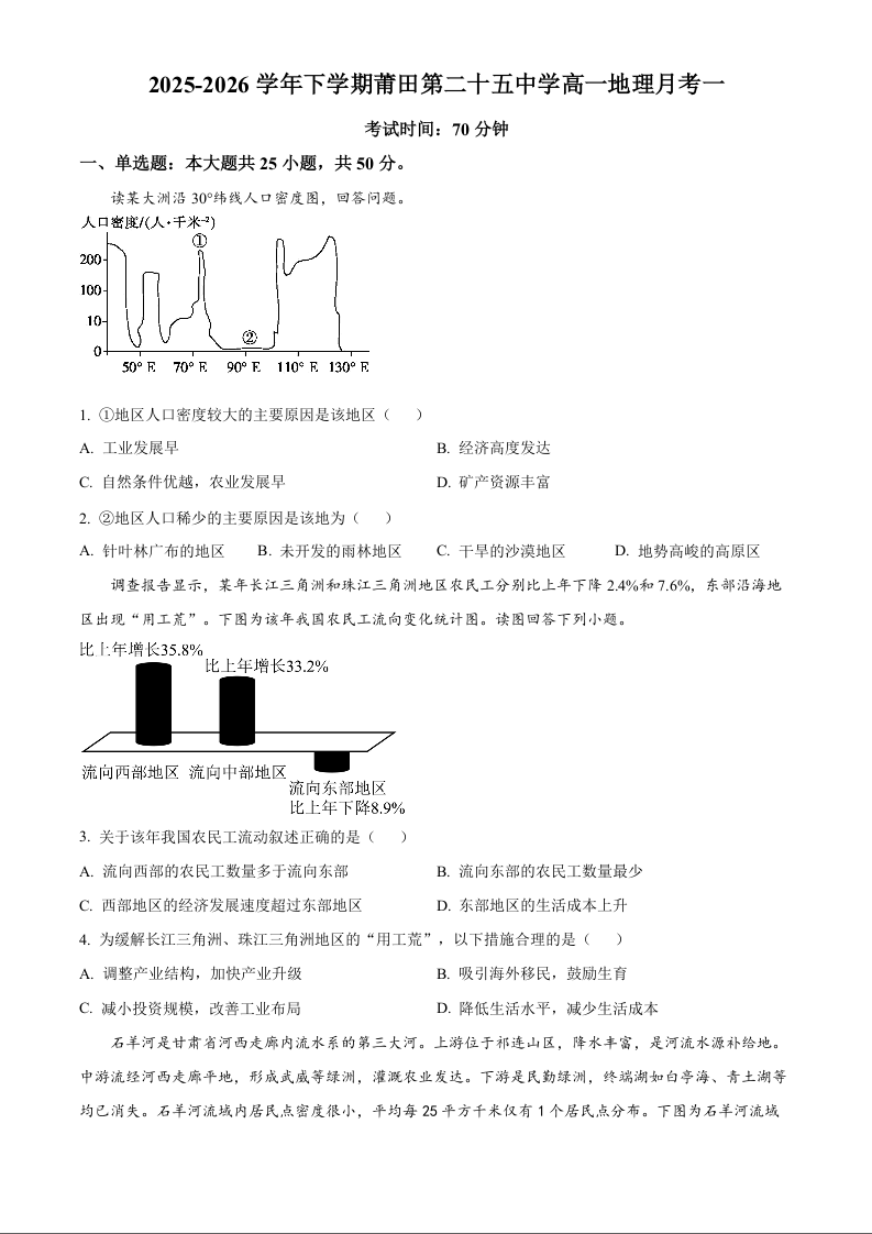 福建省莆田二十五中学2025-2026学年下学期4月月考 地理.docx