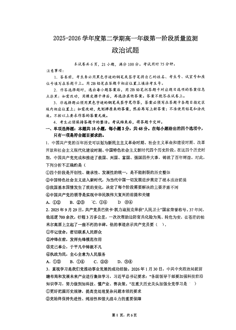 广东省深圳市多校2025-2026学年高一下学期第一阶段质量监测 政治.pdf