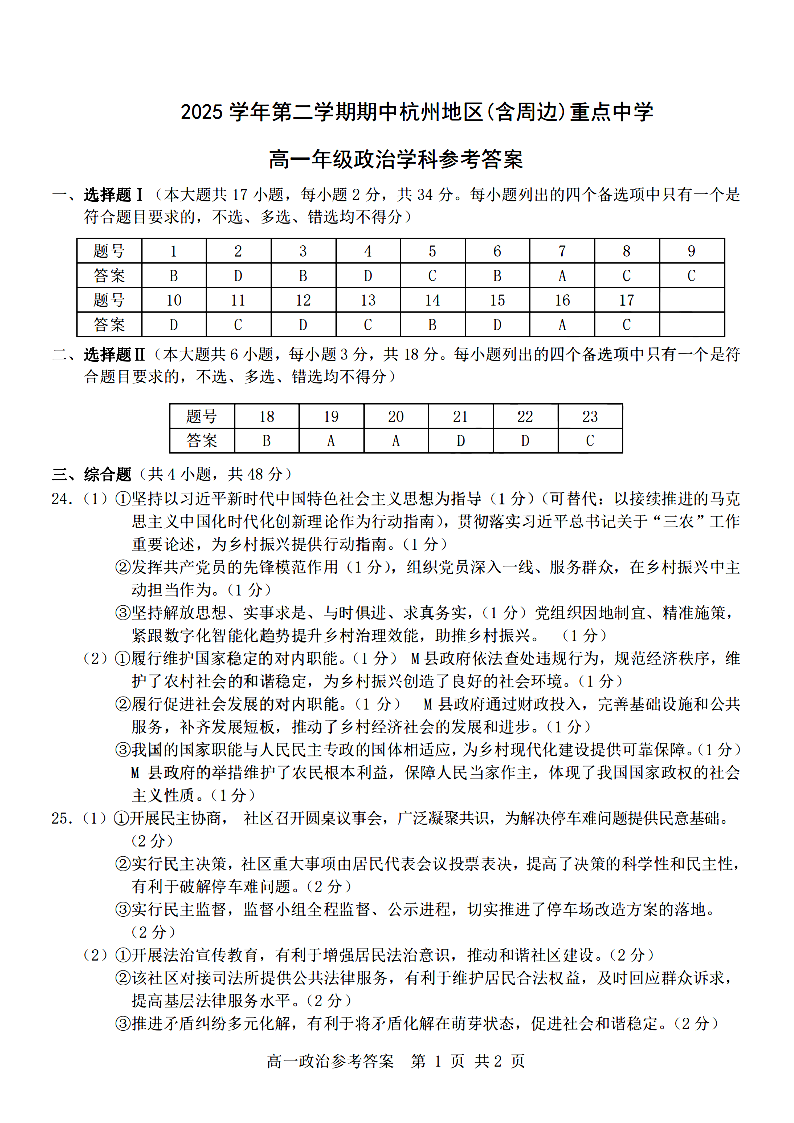 杭州地区(含周边)重点中学2025学年高一第二学期期中联考 政治答案.pdf