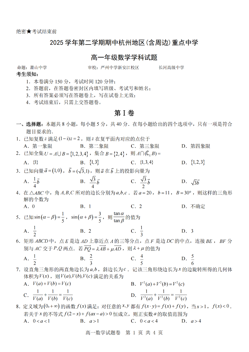 杭州地区(含周边)重点中学2025学年高一第二学期期中联考 数学.pdf