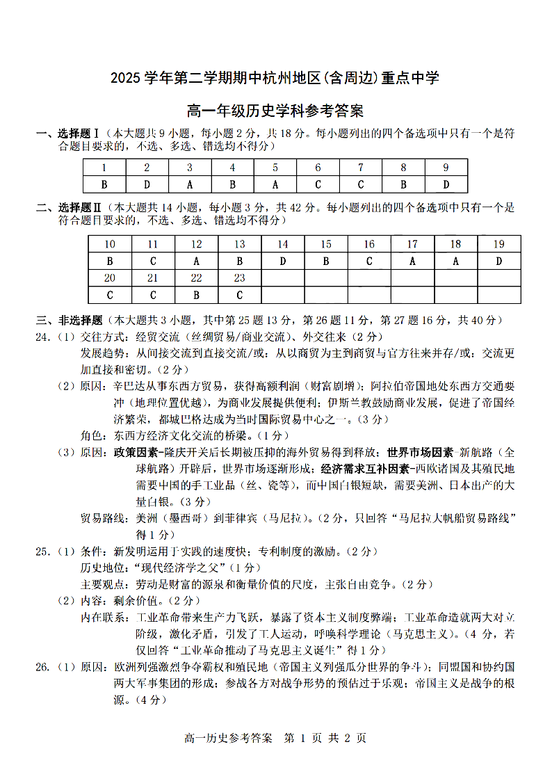 杭州地区(含周边)重点中学2025学年高一第二学期期中联考 历史答案.pdf