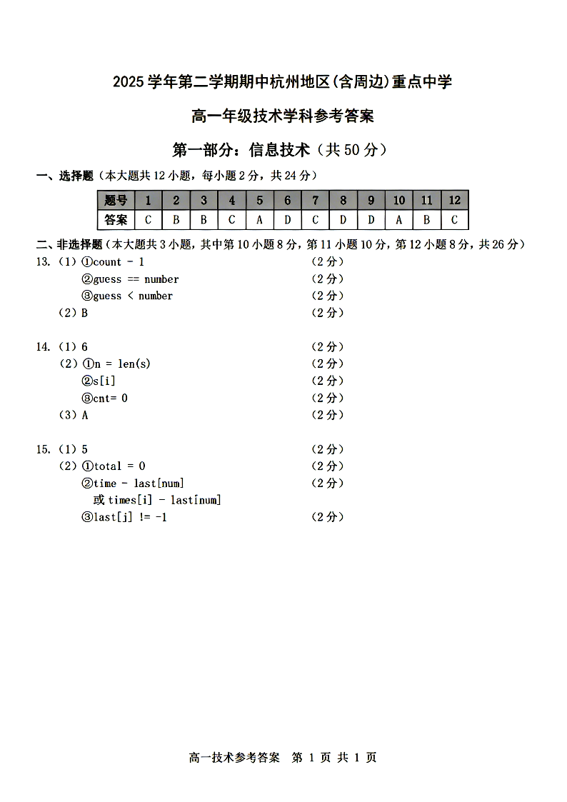 杭州地区(含周边)重点中学2025学年高一第二学期期中联考 技术答案.pdf