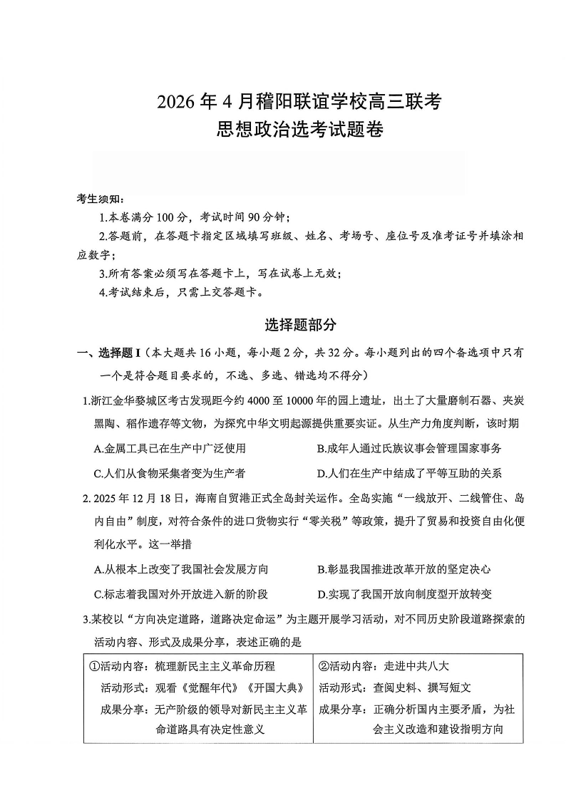 浙江省稽阳联谊学校2026年高三第二学期4月联考 政治.pdf