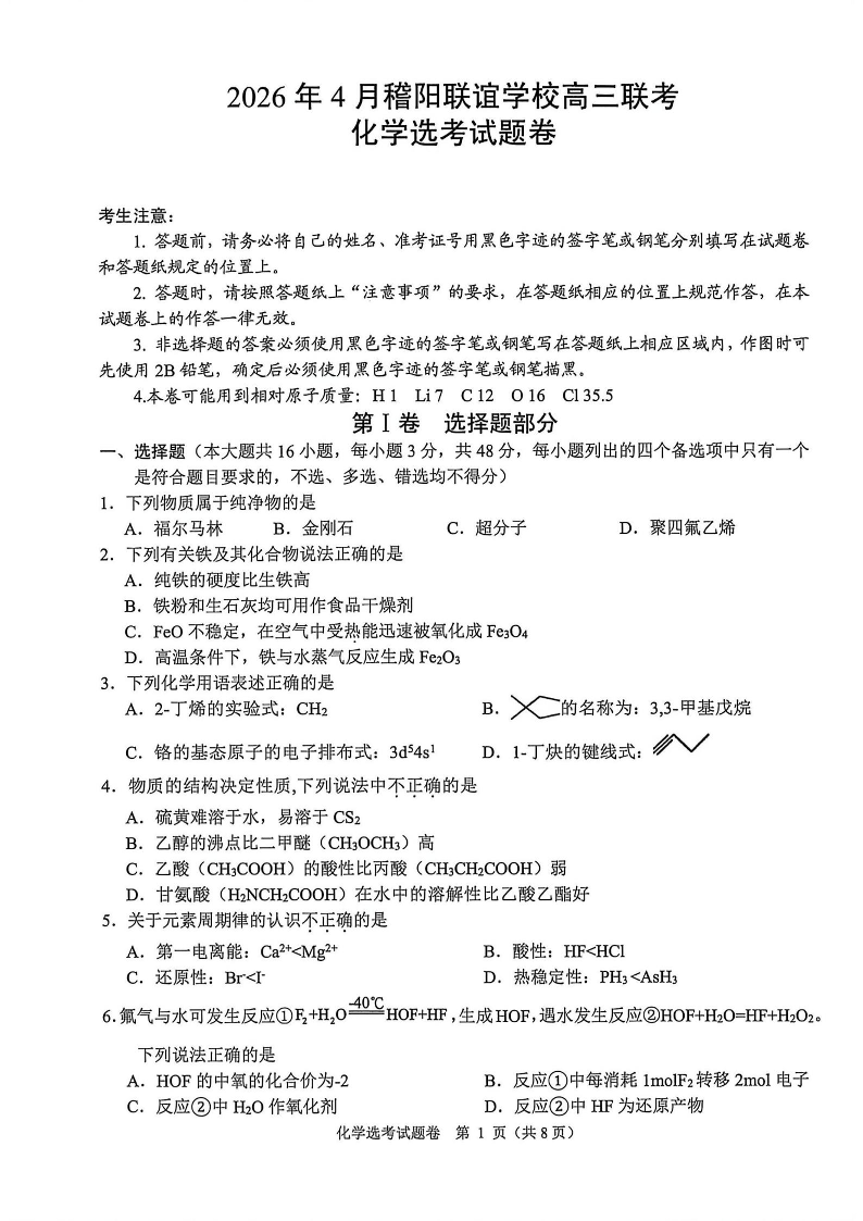 浙江省稽阳联谊学校2026年高三第二学期4月联考 化学.pdf