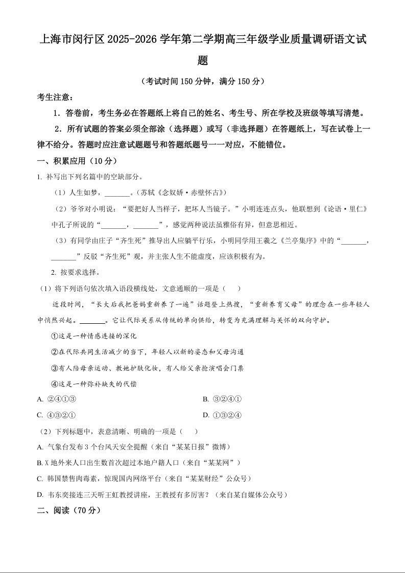 上海闵行区2025-2026学年高三下学期学业质量调研(二模)语文.docx