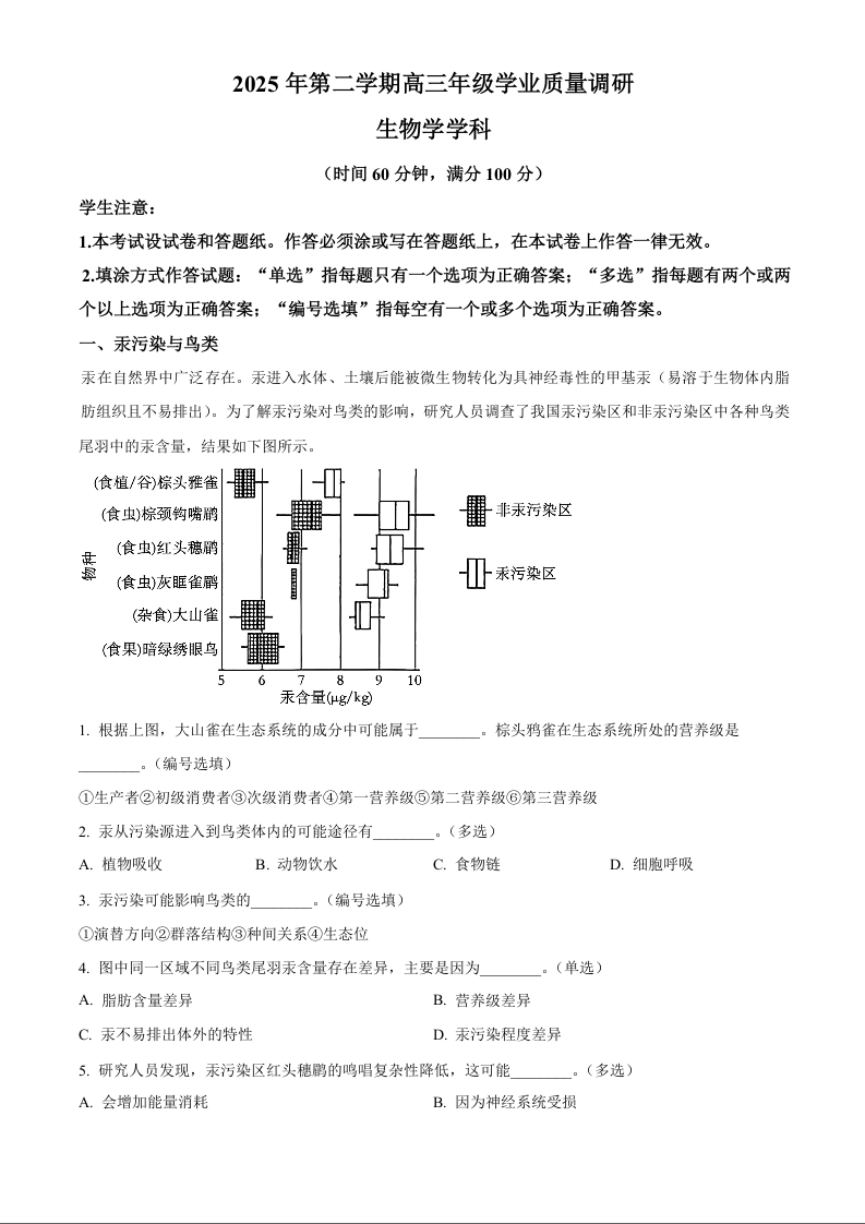 上海闵行区2025-2026学年高三下学期学业质量调研(二模)生物.docx