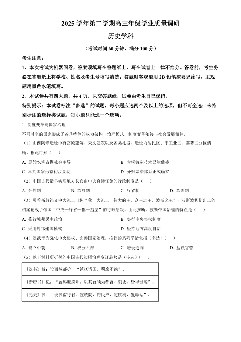 上海闵行区2025-2026学年高三下学期学业质量调研(二模)历史答案.docx