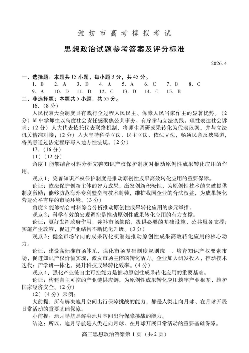 潍坊巿2026年4月高考模拟考试 政治答案.pdf