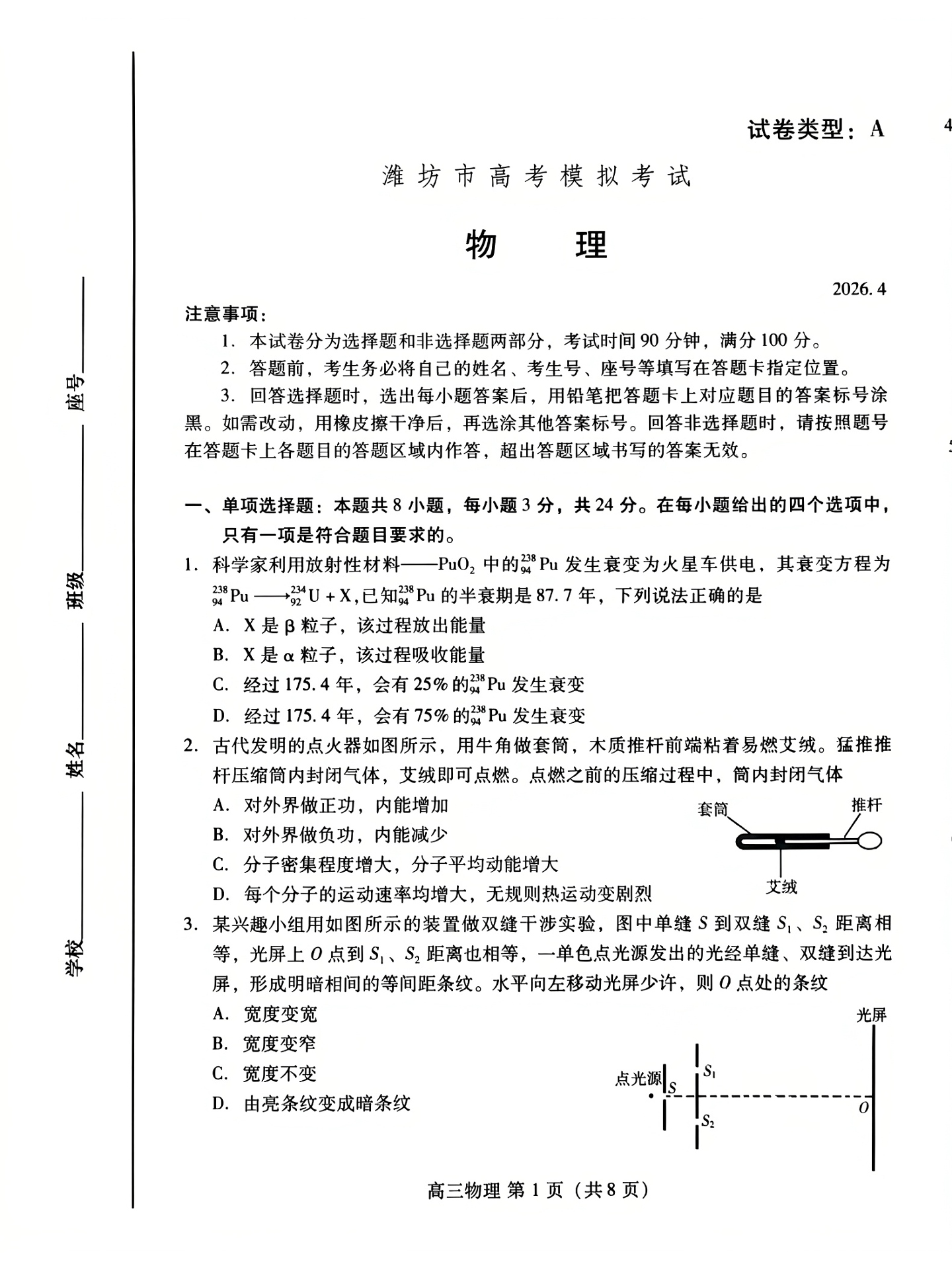 潍坊巿2026年4月高考模拟考试 物理.pdf