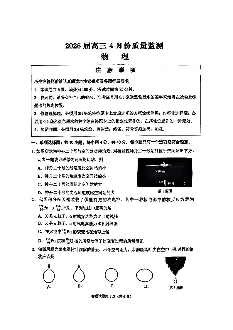 江苏省南通市、徐州市基地学校大联考2026届高三4月份质量监测 物理试题(含答案).pdf