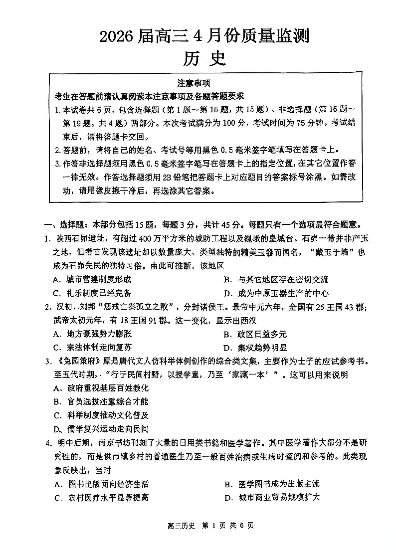 江苏省南通市、徐州市基地学校大联考2026届高三4月份质量监测 历史试题(含答案).pdf