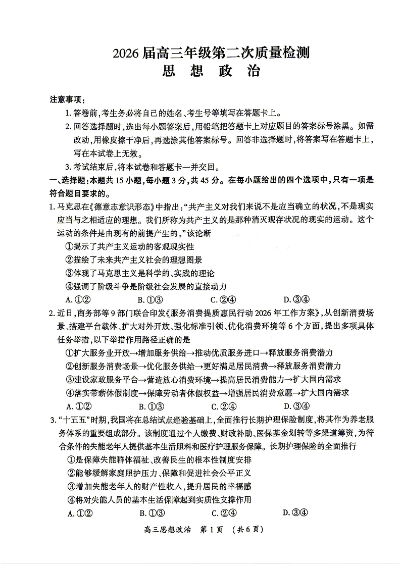 开封市2026届高三年级第二次质量检测 政治.pdf