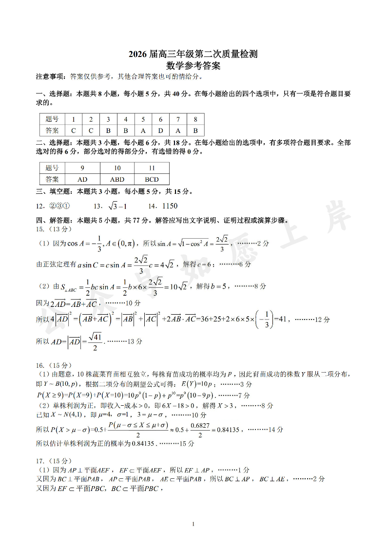 开封市2026届高三年级第二次质量检测 数学答案.pdf