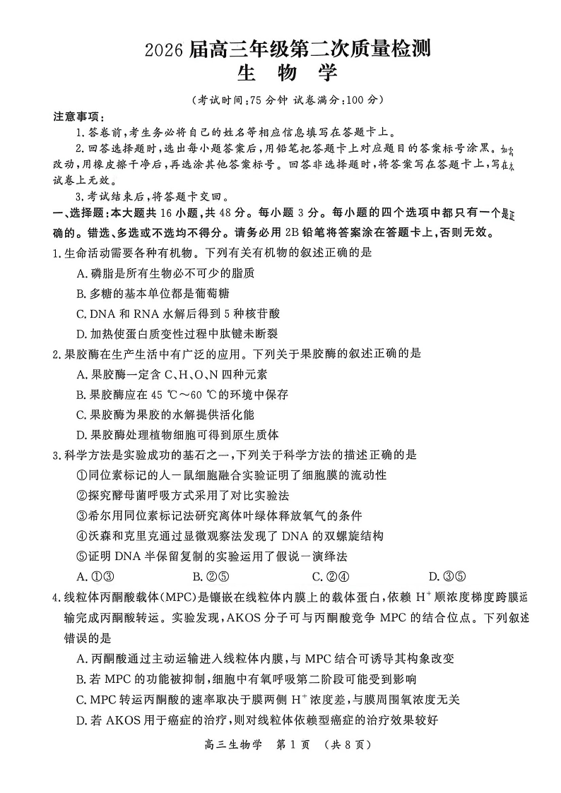 开封市2026届高三年级第二次质量检测 生物.pdf