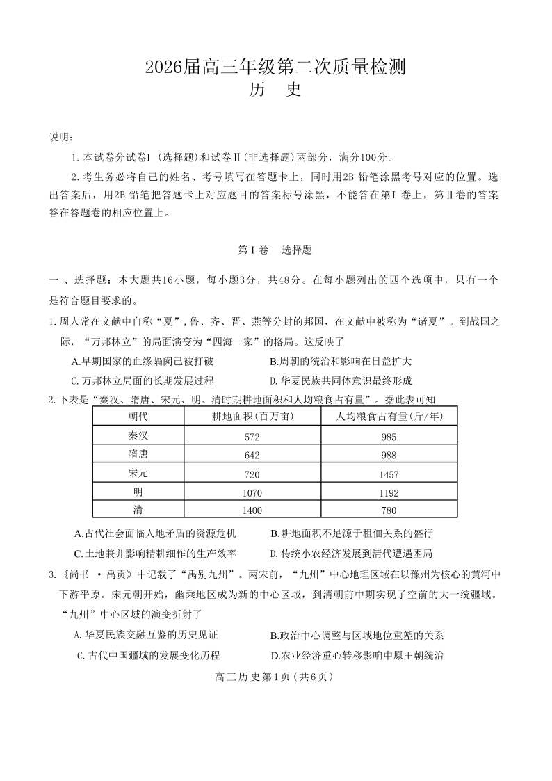开封市2026届高三年级第二次质量检测 历史.pdf