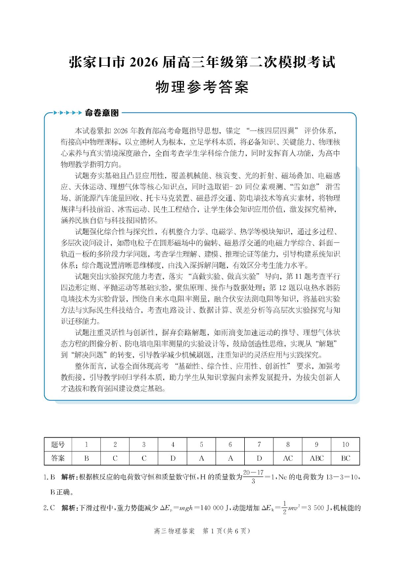 张家口市2026届高三第二次模拟考试 物理答案.pdf