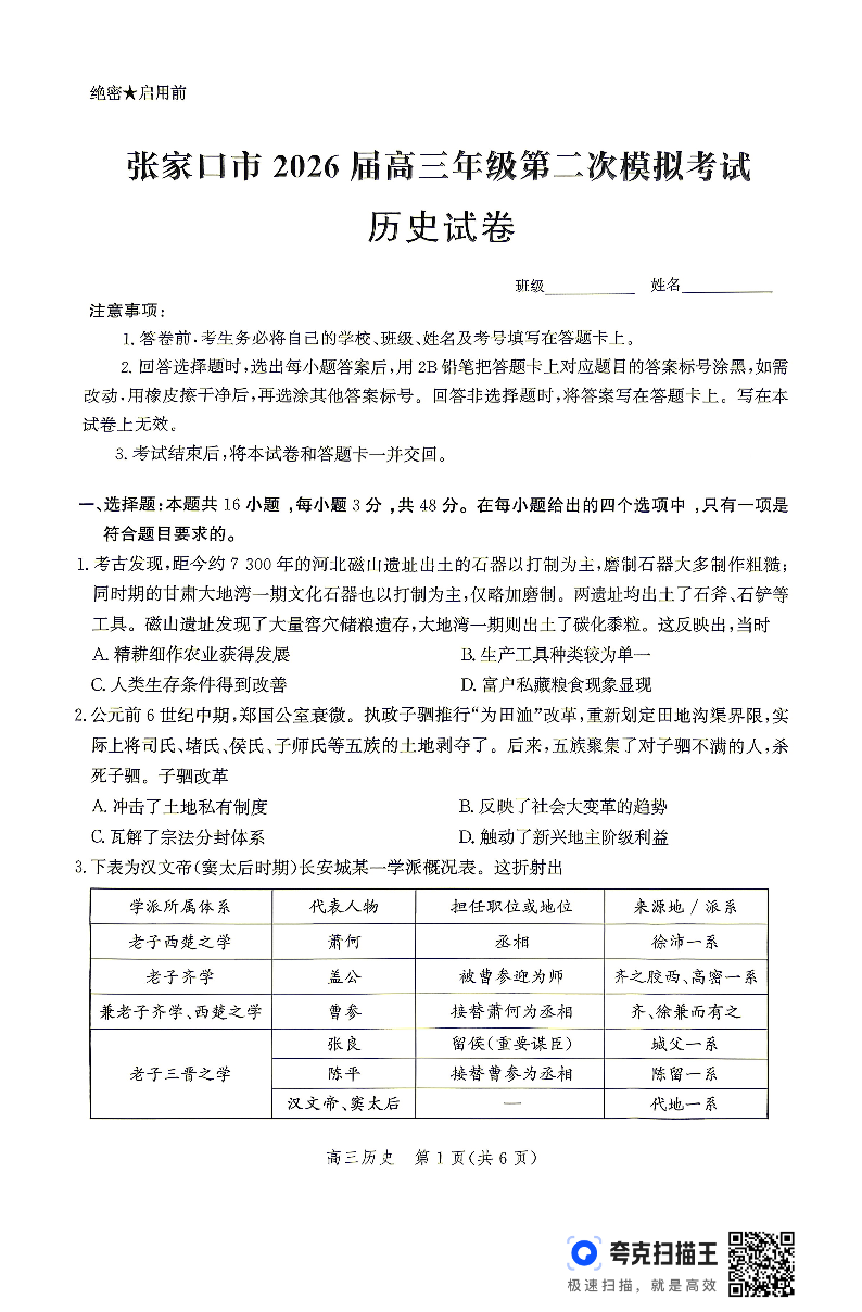 张家口市2026届高三第二次模拟考试 历史.pdf