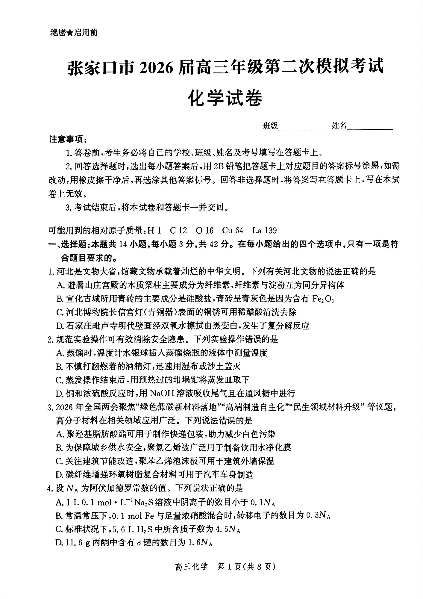张家口市2026届高三第二次模拟考试 化学.pdf