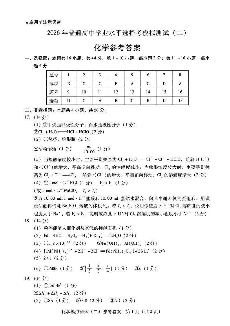 2026年普通高中学业水平选择考模拟测试(二)化学答案.pdf