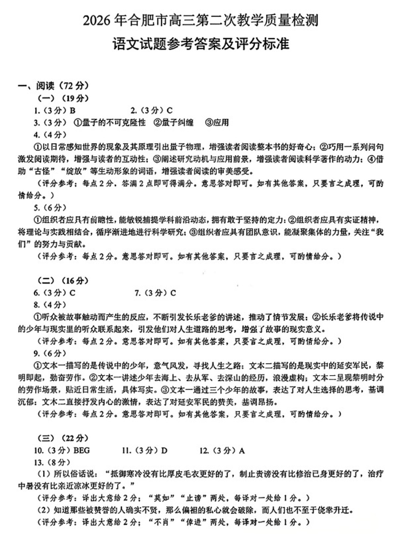2026年合肥市高三第二次教学质量检测 语文答案.pdf