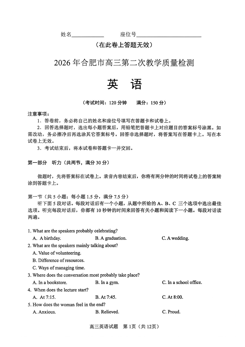 2026年合肥市高三第二次教学质量检测 英语.pdf