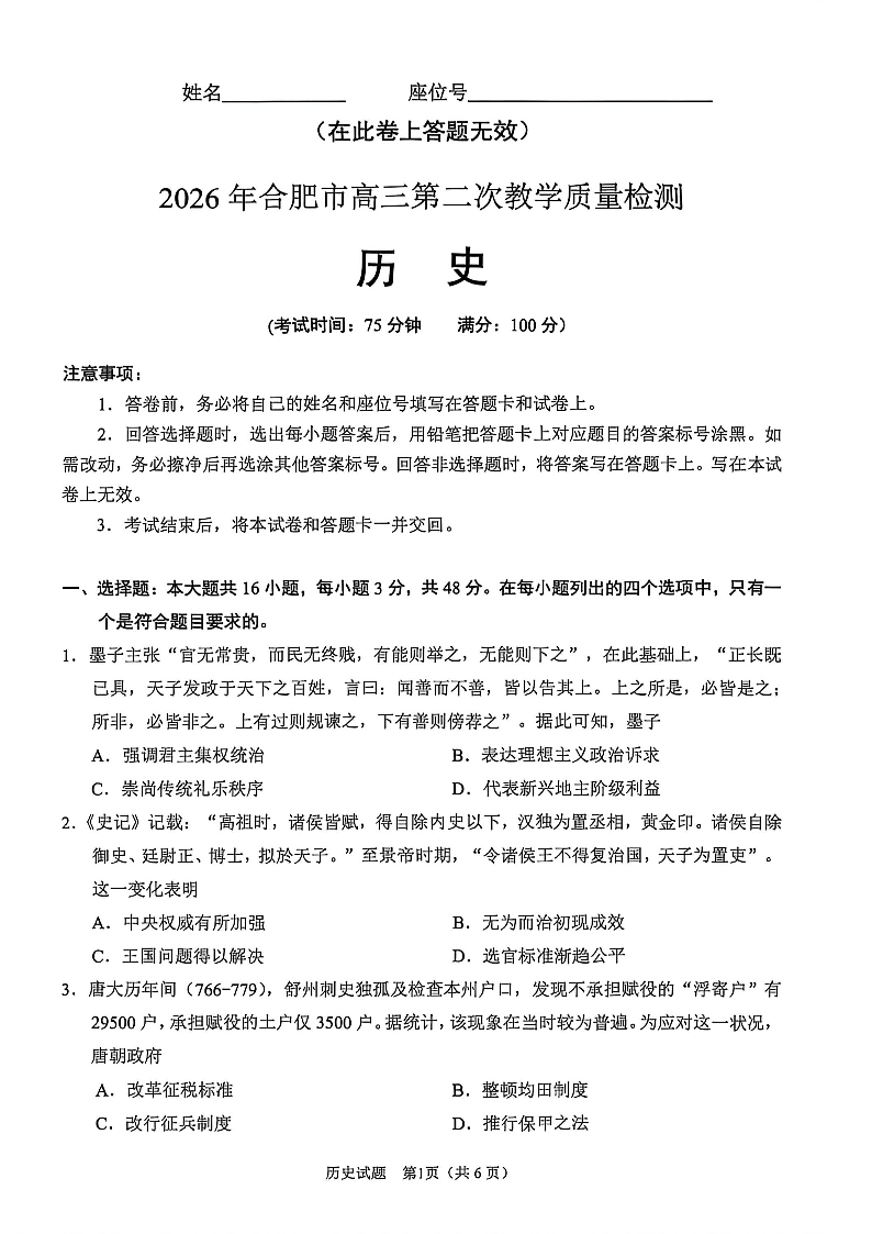 2026年合肥市高三第二次教学质量检测 历史.pdf