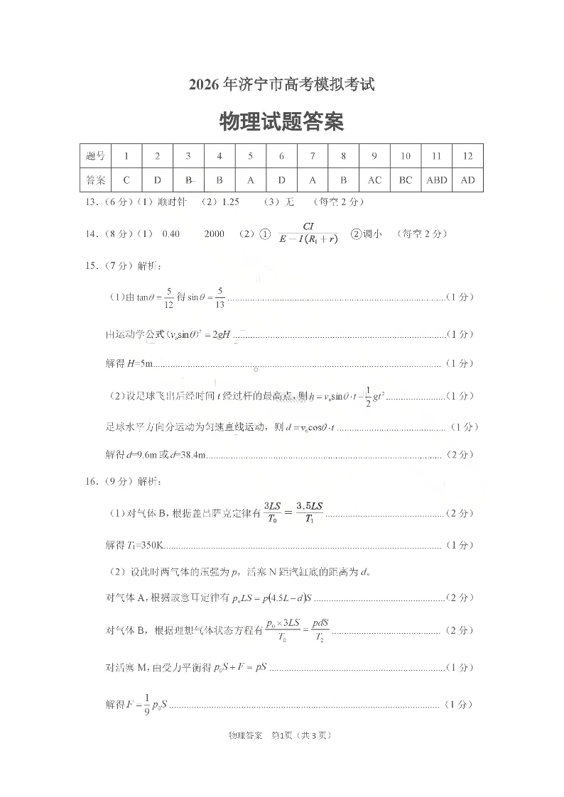 济宁市2026年高考模拟考试 物理答案.pdf