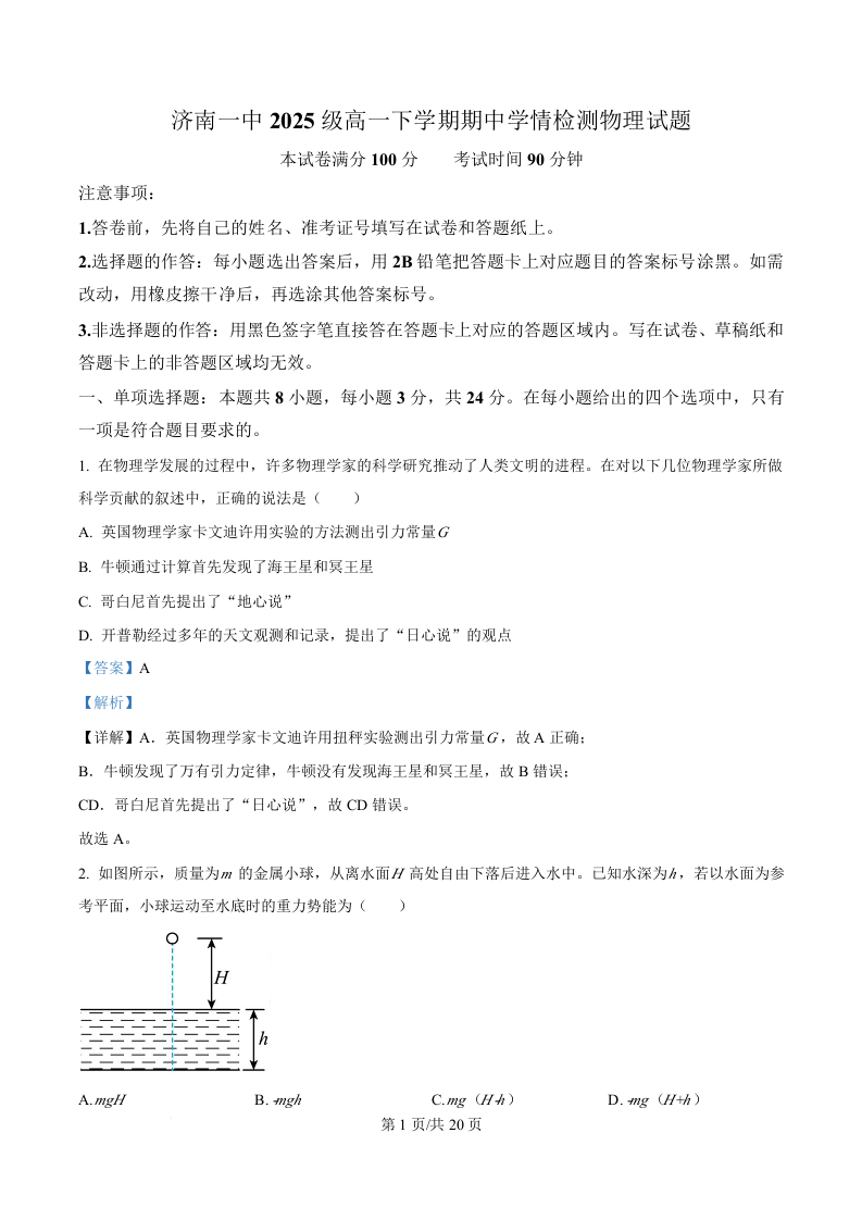 山东省济南第一中学2025-2026学年高一下学期期中学情检测 物理答案.docx