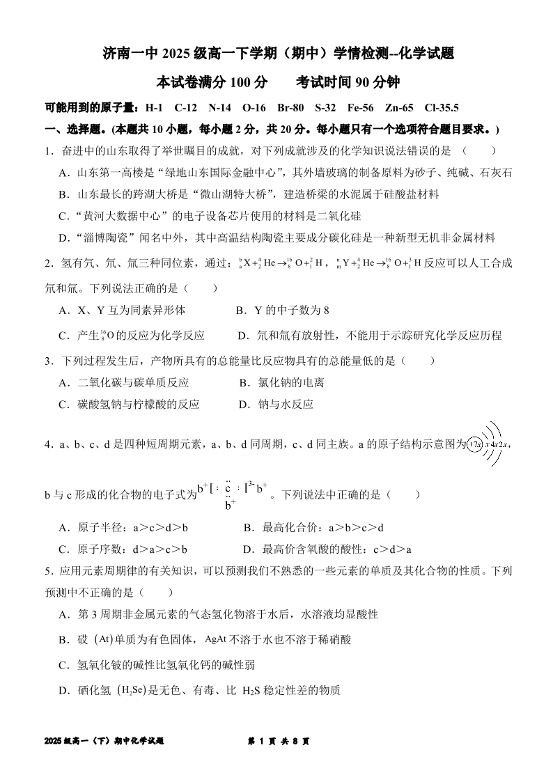 山东省济南第一中学2025-2026学年高一下学期期中学情检测 化学.pdf