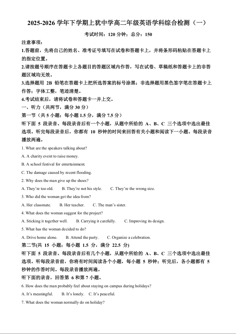 江西省赣州市四校2025-2026学年高二下学期综合检测联考(一)英语答案.docx