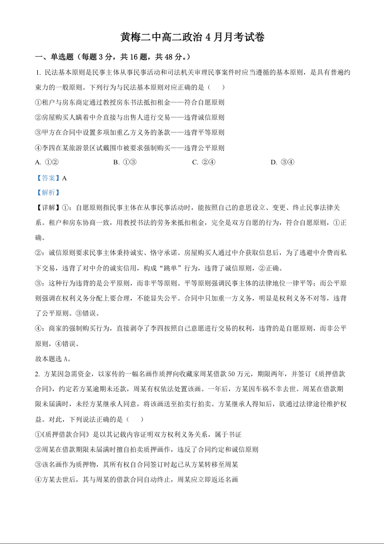 湖北省黄冈市重点校2025-2026学年高二下学期4月月考 政治答案.docx